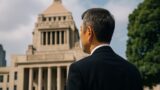 国会議事堂を背景に政策や統治の現実を見つめる日本人男性の横顔—日本における三権分立の運用と課題を象徴する情景